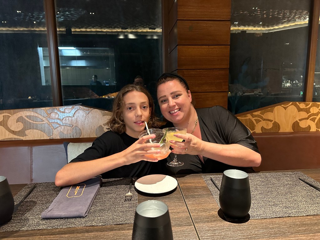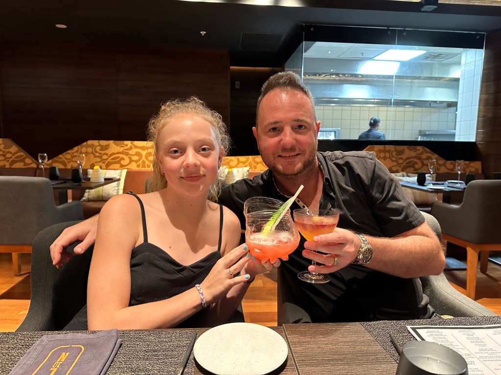 When we got home we played farkle. And then went for super at a fancy restaurant and got super cool and good drinks. Then we got tired and went to bed.