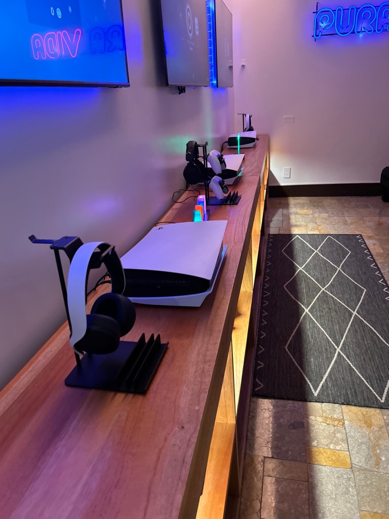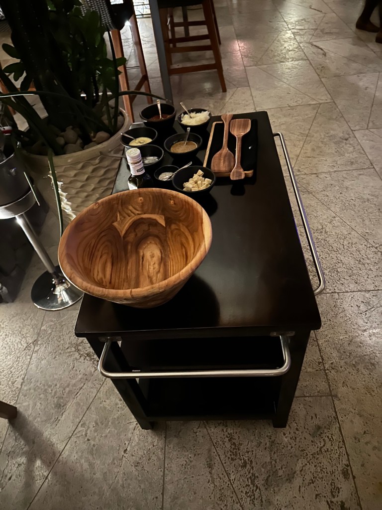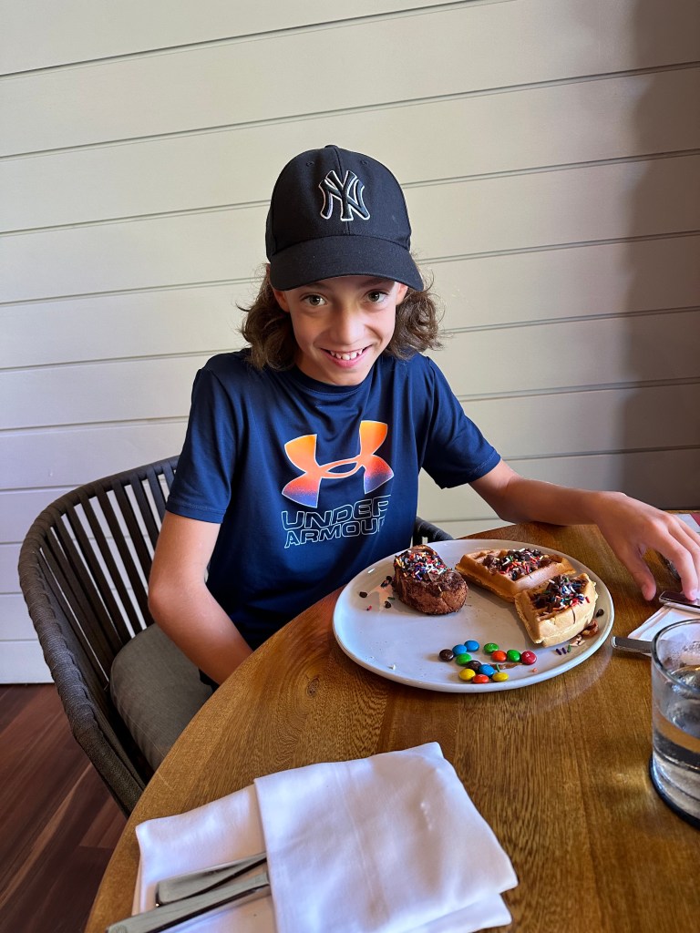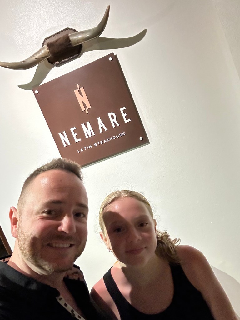 In the morning, Mikael and Scott went to the gym and then went to eat. Mikael met up with Lyvia and Michelle to go to pool and Scott went to a barber. After Scott was done his barber, we went to explore. We found the “teen’s club”. So Lyv and Mik decided to stay there while Michelle and Scott went to do sound healing. At the “teen’s club”, there was a basket ball court which Mikael loved and a pickle ball court which Liv loved and a soccer field. Inside there was a pool table and 3 PS5 gaming consoles!!! That was awesome! And then we went to the pool and got back home to get ready for the steak house.