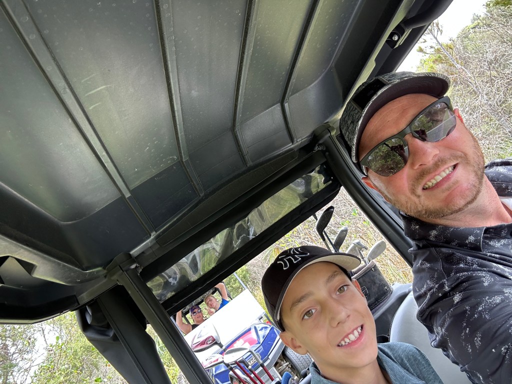 Aujourd’hui, mon père s’est réveillé très tôt pour aller au gym. Ensuite, quand il est revenu, il nous a fait des sandwich aux oeufs. Âpres, on a joué aux cartes. Ensuite, mon père, Lyv et moi on est allé acheter un gilet de golf. Plus tard, on est allé jouer au golf et c’était vraiment cool. Mais les deux seules choses qui étaient bizarres c’était qu’il y avait plein de chiens sur le terrain et deux trous à chaque vert. Pour souper, on a mangé au restaurant et fait dodo.