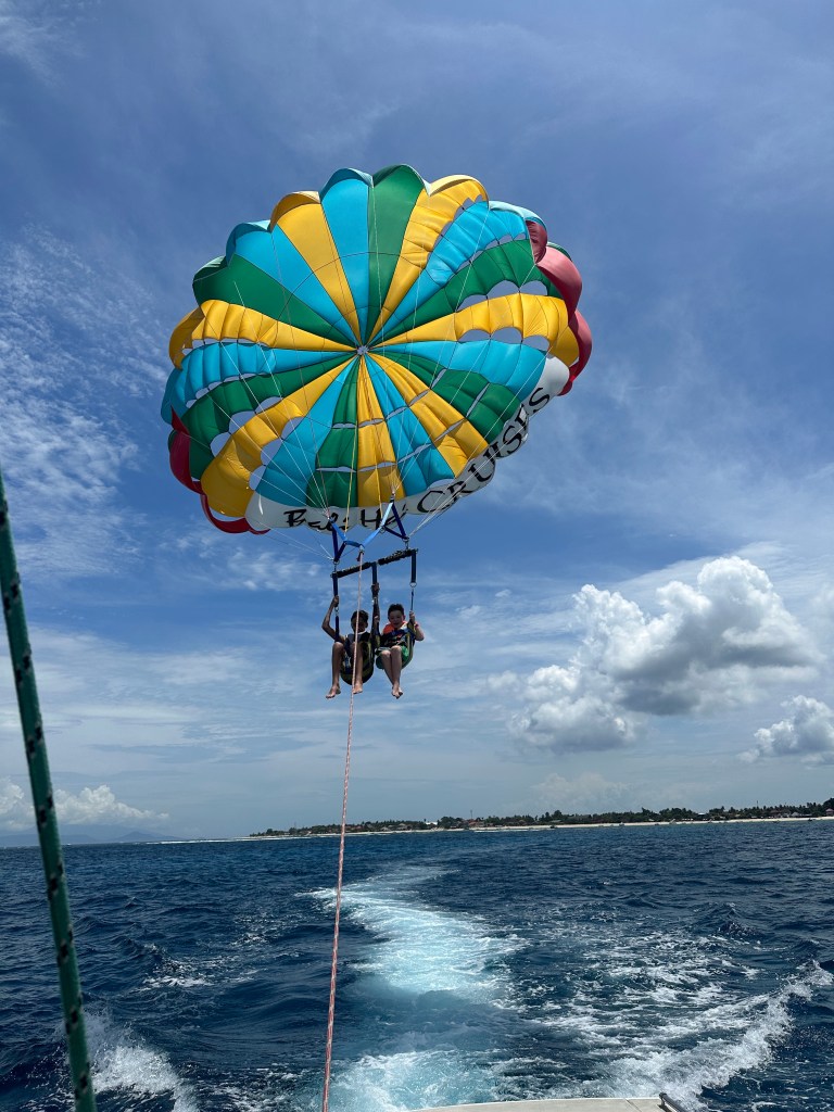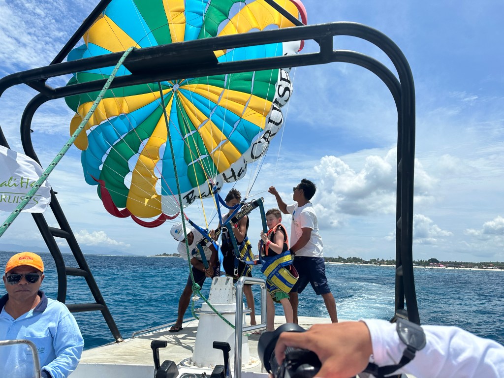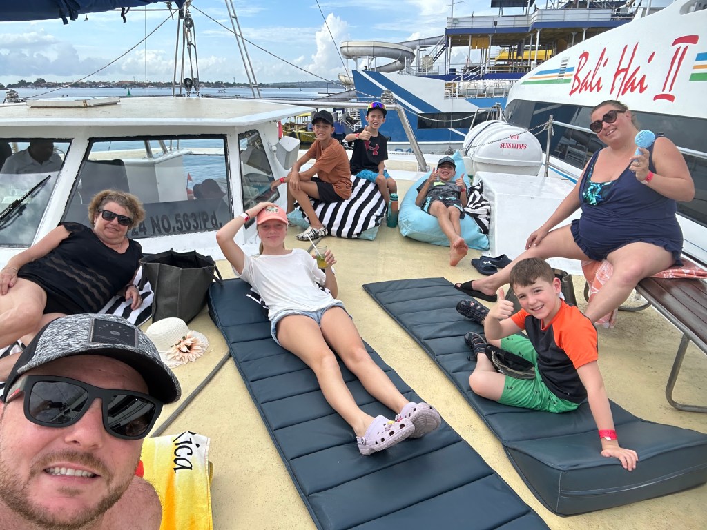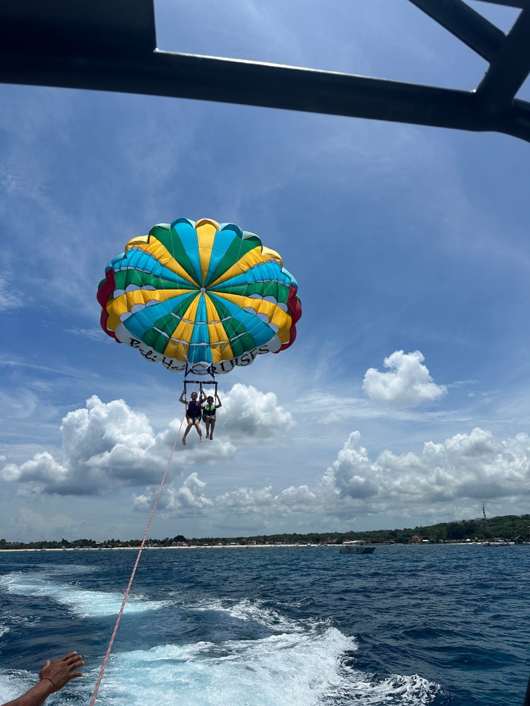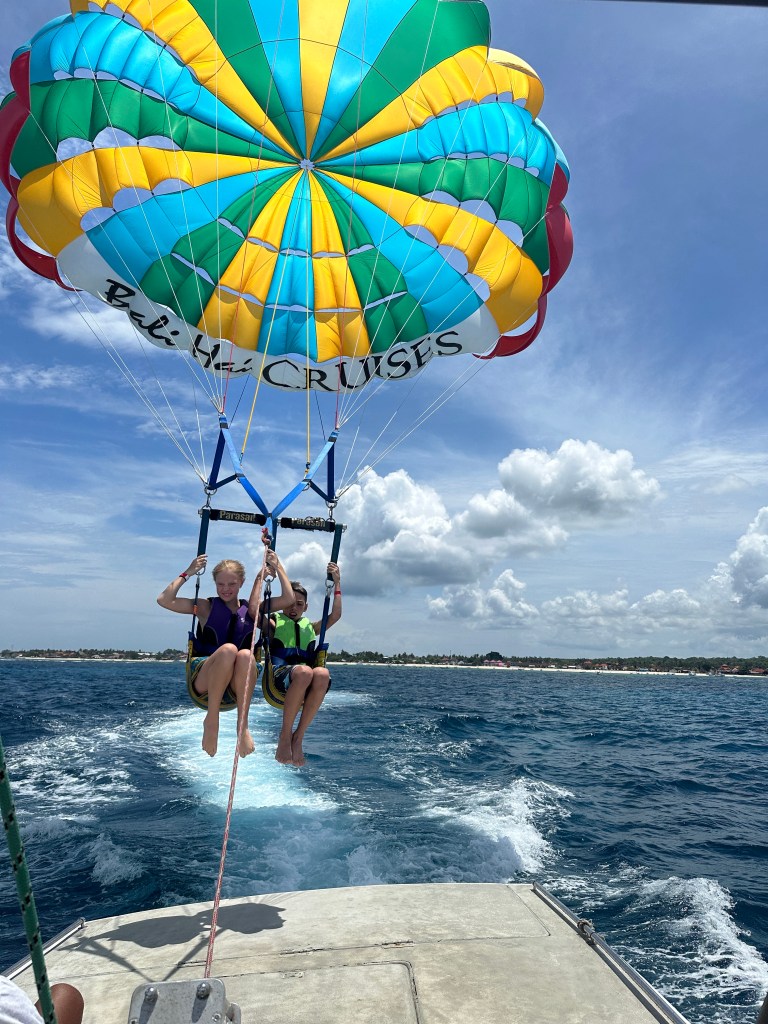 Aujourd’hui, il fallait qu’on se réveille à 6 heures du matin car notre conducteur nous ramassait a 6h45. On s’en allait en catamaran. Une fois rendus au port, il a fallu qu’on attende 1 heure pour finalement qu’on embarque sur le catamaran. Une fois installés à nos places, on était dans le soleil alors on a tous brûlés. Ça prit 1 heure et demi pour se rendre à l’île de Nusa. On est arrivé à un quai avec pleins d’activités d’eau. On a fait du “snorkeling”, on a glissé sur une très grosse glissade d’eau, on a fait des flips d’une ‘diving board’, on est allé sur un banana boat et on a fait du “parasail”. La première activité était le “snorkeling” et on a vu pleins de poissons. On a adoré ça. Ensuite, on a fait la glissade d’eau très souvent car on a bien apprécié. Ensuite, nous avons fait du bateau banane et il ne fallait pas tomber. C’était comme de la tube. On s’est amusés a faire des flips par en avant et par en arrière sur une planche de plongeons. Après, on a décidé que nous voulions faire du “parasail” alors il y a un bateau qui nous a apporté à un autre bateau pour nous emmener dans les airs. Mikaël et Simon sont allés en premier, ils n’avaient même pas peur. Tandis que moi, j’avais très, très peur. Mais quand Mik et Simon ont eu fini, ils m’ont dit que ce n’était pas si pire alors je l’ai fait avec Xavier. J’ai adoré ça et je veux définitivement en refaire. Après toutes ces activités, on s’est rendus sur la plage pour dîner. C’était un petit buffet mais très bon. Par la suite, on est allé se baigner dans la piscine à côté de la mer. On voulait faire de la planche à eau (paddle board) alors Simon et moi sommes allés ensemble. Mik et Xav sont allés ensemble et Will est allé tout seul. On a tous eu beaucoup de plaisir. Après, on est retourné sur le catamaran pour revenir à Bali. C’était un autre trajet de 1 heure et demi. Alors, on a dansé sur la catamaran. Arrivés à Bali, on a pris une camionnette pour revenir chez nous. Quand on est arrivés à notre Villa, on s’est baigné et on a mangé du bon saumon.
