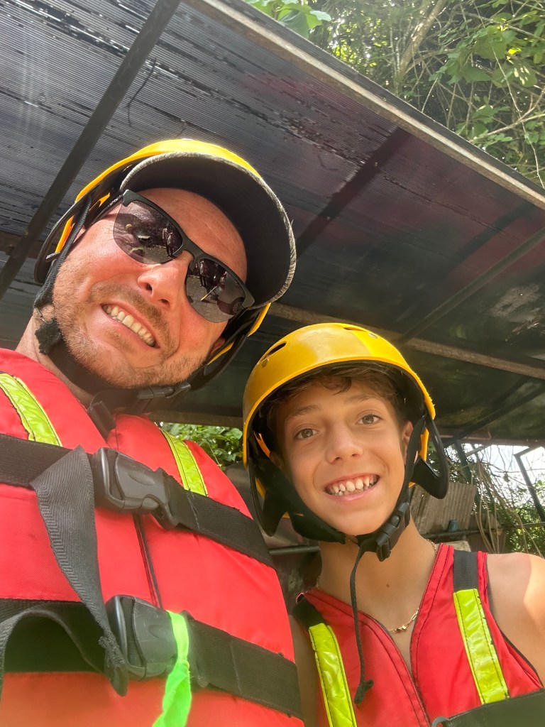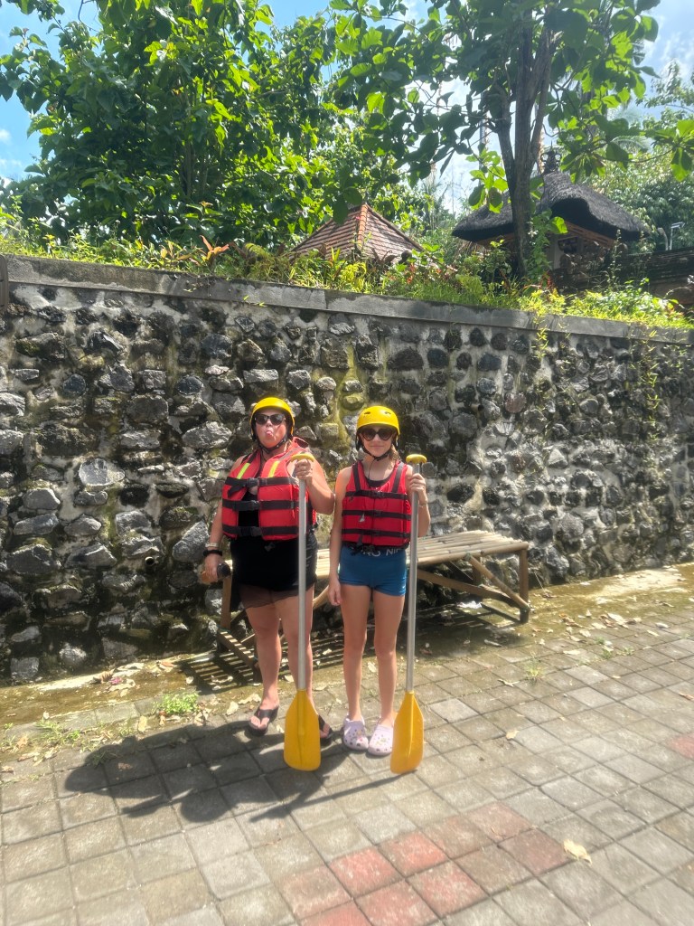 Today, we woke up pretty early to go rafting! We got a ride to the Four Seasons hotel in Ubud. They had invited us to a rafting experience. We said yes! We arrived there to eat after a 2 hour ride. Then we had time to kill so we went in the pool. Finally, it was time. Once there, we had to put on life jackets and a helmet and got our paddle. We had to go down 300 stairs. Mom was scared but we all made it down safely. Then we all had to hop in one big raft. It was like a lazy river but in real life and a little crazier. We had so much fun. After arriving back at the Four Seasons, we went straight in the pool. Then, we made our way back to our resort. Once home, it was souper time so we got dressed and went to eat.