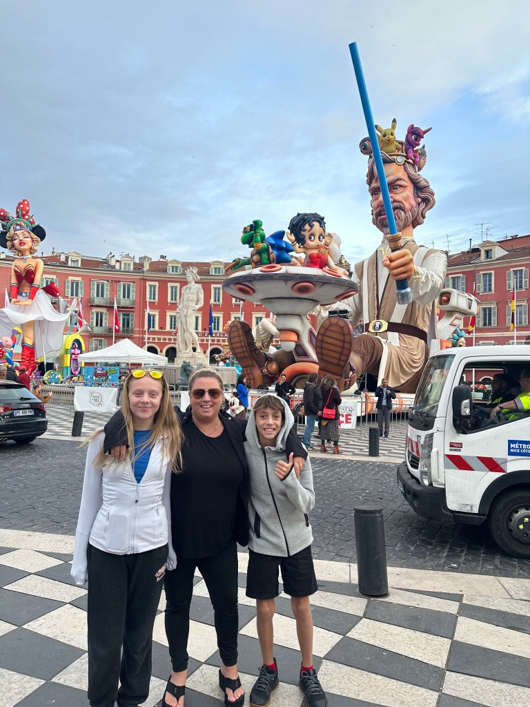Aujourd’hui, moi je me suis réveillée très tôt, à 4h du matin. Une fois que tout le monde s’est réveillé, on est allés déjeuner en auto. Par la suite, mon père avait un rendez-vous chez le barbier pendant que les filles sont allées prendre une drink et une crème glacée. Ensuite, on s’est enligné pour le village du Carnival de Nice. En se rendant, on s’est arrêtés dans un restaurant pour diner. J’ai mangé des bonnes moules. On a fait une grande roue où Lyvia avait vraiment peur. D’en haut, on a pu voir les autres choses à faire. Donc on a continué notre marche vers un train qui nous a fait faire le tour de la ville et nous a fait apprendre des choses sur Nice. Pour finir la soirée, nous sommes retournés à notre maison pour faire dodo.