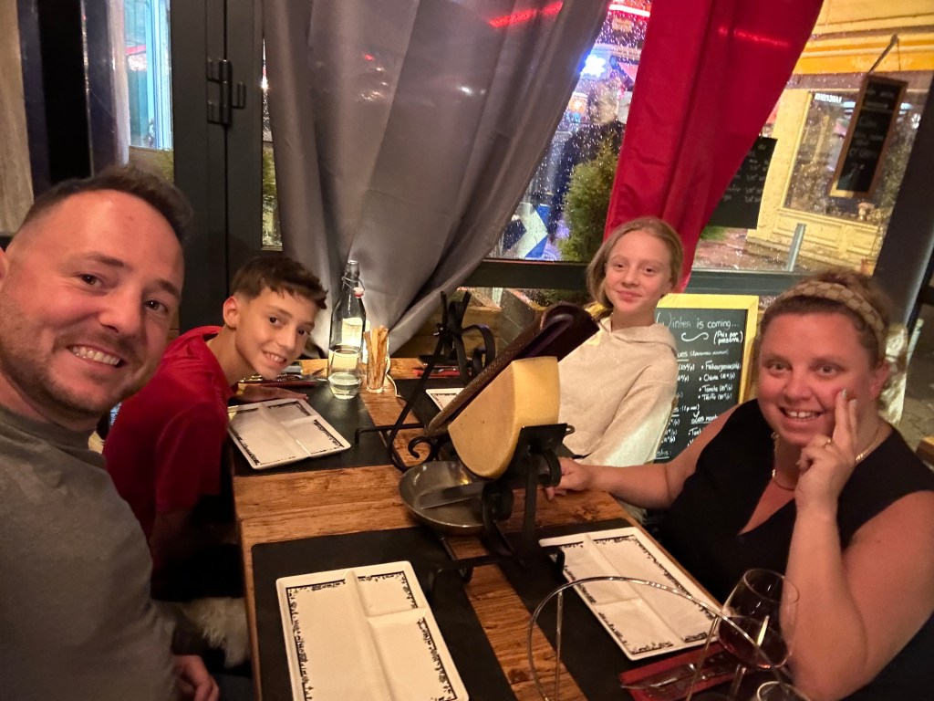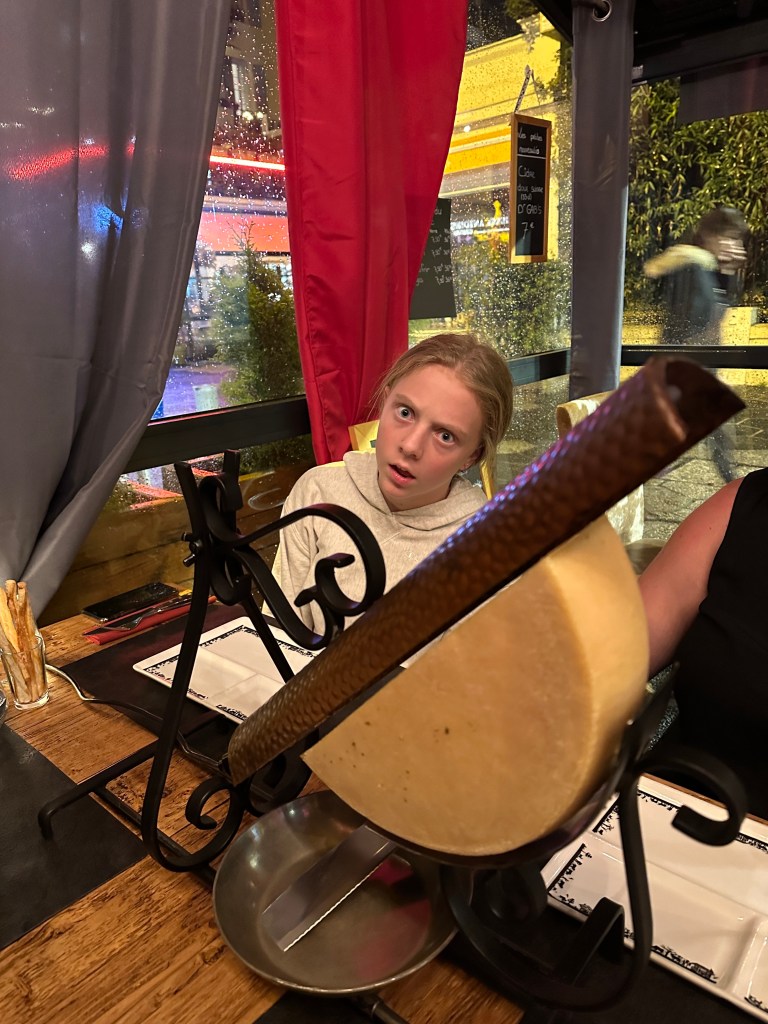 Today we ate breakfast in the morning and I got a haircut. When we got back we went out for lunch at a sushi place that was really good. After that, we walked around and spent some time at the Carnival. We got there and it was not organized, we couldn’t see the parade so we decided to leave. We went back home and learned to play “dame de pique”. For supper, we went out to a “raclette” restaurant. There was a machine melting the cheese into a pan where we could grab it. It was awesome!