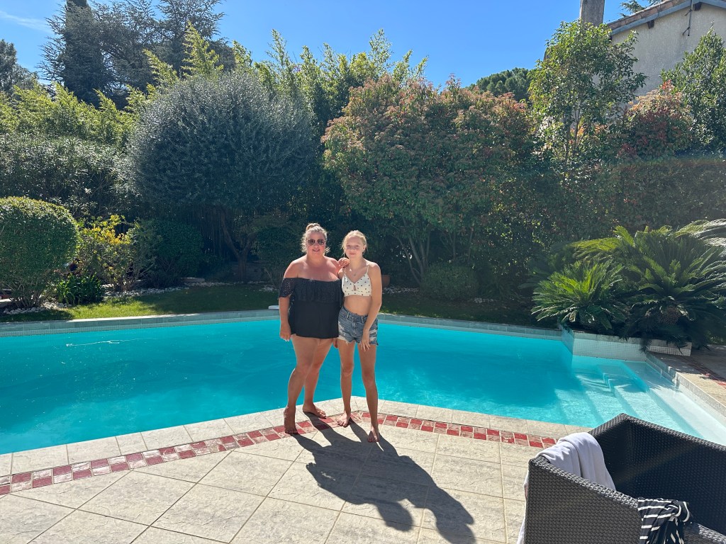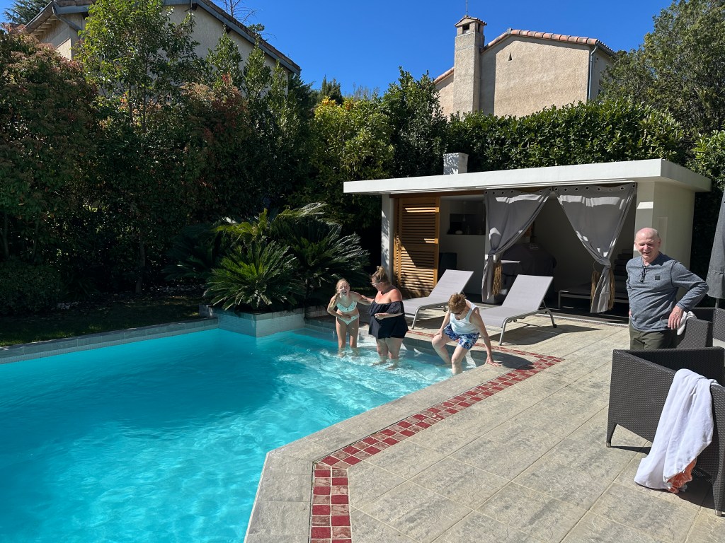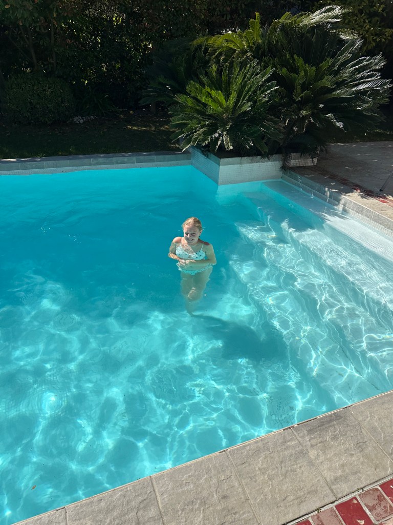 Today, we didn’t have anything planned so we just went with the flow. The first thing I did when waking up, was go on a walk around our new neighbourhood with my dad, Mik and my grandpa. We found the farmer’s market. We bought fruits and a couple of other things. After the walk, my mom and I dared each other to go in the really, really cold pool. We both did it and survived. Later, the adults went to spend the evening at the cabaret and had lots of fun.